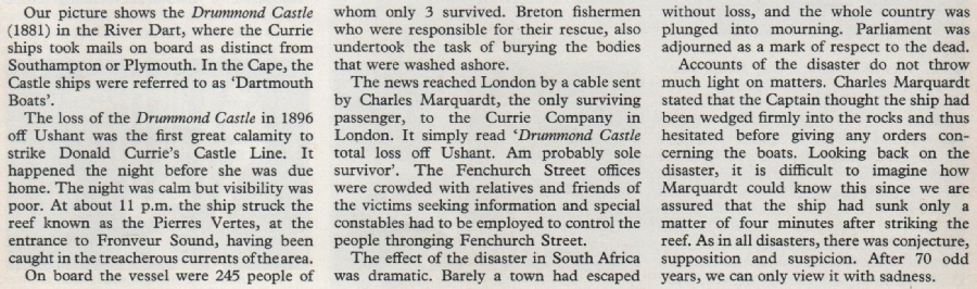 The news of the Drummond disaster was received with horror in Johannesburg. The Castle Company’s and newspaper offices were besieged by anguished friends and relatives of those on board the ill-fated ship beseeching for news. The scenes were terrible, men even weeping.