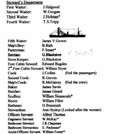The crew were assembled on deck and ordered to prepare the lifeboats for abandoning ship. The meal of beef, sausages, biscuits and lobsters prepared for breakfast by Chief Steward Royal’s department was quickly transferred to the lifeboats. At 8 am. Captain Wait gave the order to disembark. In this picture John Henry Royal in steward's uniform is seated in the middle. The thirty women and children were first handed down to the eight boats that had been assembled. The rest of the passengers and crew followed them. Captain Wait was the last to descend the now sloping ship’s side as they all pulled away on the calm sea to watch the American go down stern first six hour later.