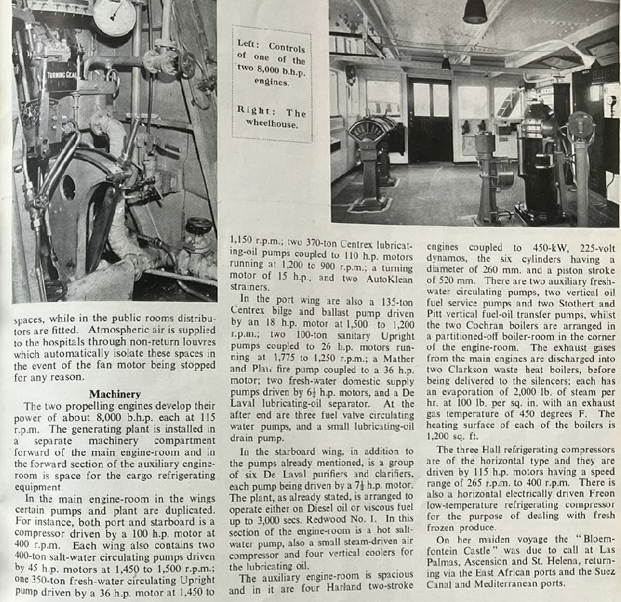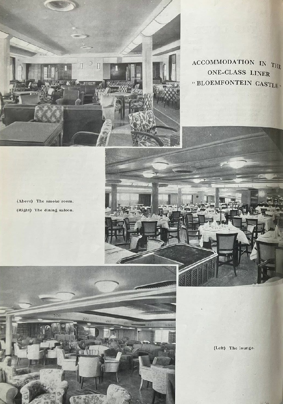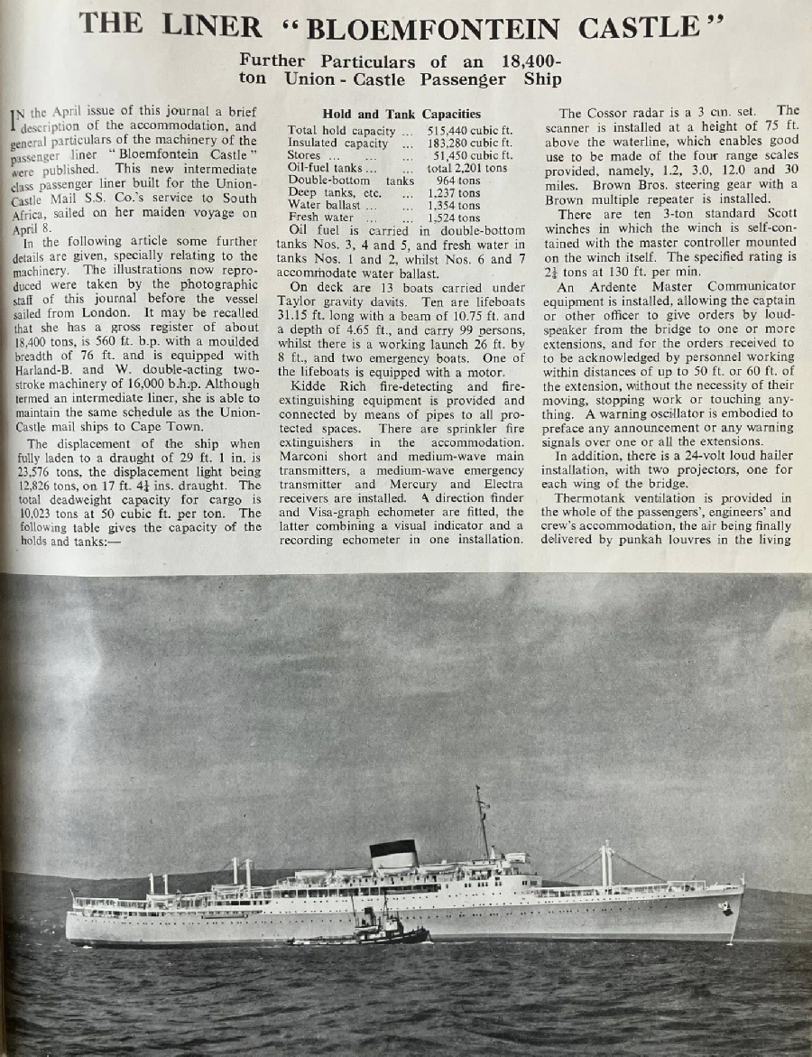 BLOEMFONTEIN CASTLE was built in 1950 by Harland & Wolff at Belfast with a tonnage of 18400grt, a length of 594ft 6in, a beam of 76ft 4in and a service speed of 18.5 knots.