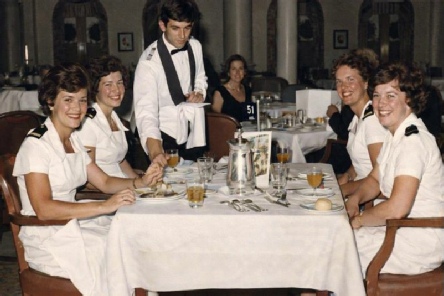 Myself (Jo Dawson/nursing sister), Ann Tinsley Puserette, 1st class Dining Rm. Steward (unknown), Sara Deane – Purserette, and (I think)
