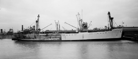Assault Ship M.V. Empire Elaine on the Clyde in early 1943 being repainted in preparation for Operation Husky, the invasion of Sicily (National Maritime Museum collection).