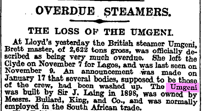 When off the west coast of Ireland heavy weather arose; the ships parted company and Umgeni was never seen again. Bodies and wreckage were eventually washed ashore but how the vessel met her end was never established for no one lived to tell the tale.
