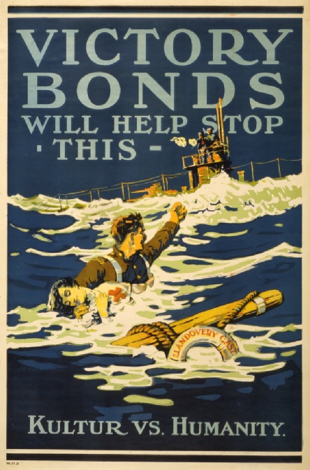 A Canadian Victory Bond poster showing a Canadian soldier holding a dead Red Cross worker shaking his fist at the U-boat that had torpedoed the HMHS Llandovery Castle.