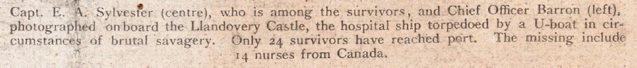 'The Union-Castle hospital ship Llandovery Castle bound from Halifax, Nova Scotia, for Liverpool, was torpedoed on June 27th, 1918, 114 miles south-west of Fastnet Rock.