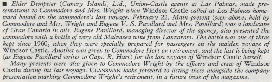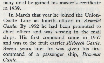 His saddest voyage was to deliver the Kenya Castle, I think,to the breakers at Faslane in the Gareloch, she was in prime condition and he let her rip off Arran on the way to the breakers.