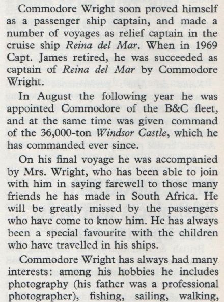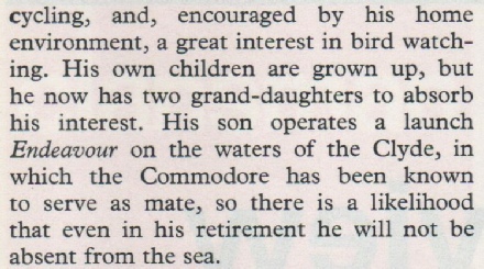 I found him a very pleasant man with a sense of fun. On passage from Glasgow to Liverpool on Rotherwick Castle his took the ship round the bay of Millport on the Scottish coast, blew the whistle very loud and very long and then proceed on the intended track.