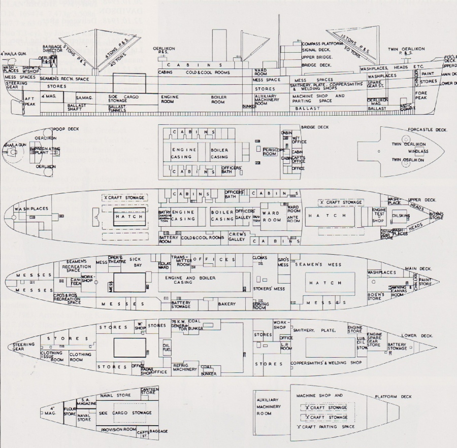 Bonaventure’s departure was initially delayed, and in January she embarked six XE type submarines. She left the United Kingdom on 21 February, sailing for Australia via the Panama Canal. After going through the canal, she crossed the Pacific, arriving at Pearl Harbor on 7 March. The attitude of the US Navy was discouraging, and the use of midget submarines was not looked on with much enthusiasm.[1] Bonaventure arrived at Brisbane on 27 April and received approval to move nearer to the operational area and to approach the local US Navy authorities. She subsequently sailed to Townsville, Queensland in May, where a visit was made by a senior officer of the 14th Flotilla to the US Navy Base at Subic Bay. The Americans remained sceptical and suggested that the Bonaventure be converted to perform a wider support role. On 31 May the proposal was made to use midget submarines to cut Japanese underwater telegraph cables.