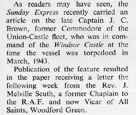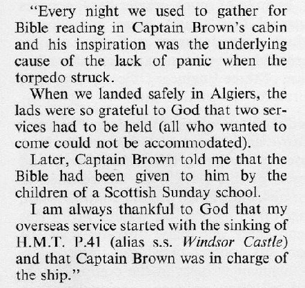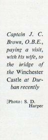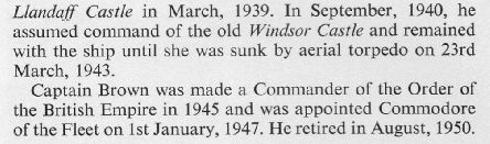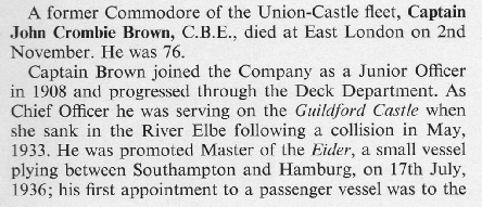 More than twenty years afterwards I went on board the mail ship Pretoria Castle to talk to Captain John Crombie Brown, commodore of the Union-Castle fleet and soon to retire from the sea. Captain Brown was known to his crews as "Eternity" Brown, for he held Bible classes in his cabin for all who cared to attend. I knew that Captain Brown had been round the world in sail and had served through two world wars. He must have had many escapes and adventures; but I was not prepared for the answer he gave me when I asked him to recall the most desperate episode of his sea career.
