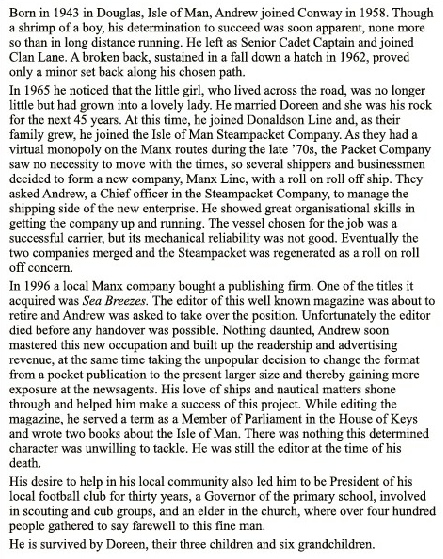 Andrew was, however, a man of many parts. Elected as MHK (Member of the House of Keys) in the Manx parliament in 2002 he served as a member in various departments including transport and education until 2006. His many other interests included church, youth work, sport, writing, travel, gardening, walking, Manx history and culture and the World Manx Society. As editor of Sea Breezes he made many friends all over the world. He was a proud Manxman, but above all he was a family man. His love of the sea and ships never faltered and he loved nothing better than to swap tales with fellow mariners. To all those who knew Andrew, his passing will be greatly mourned and he will be sadly missed.