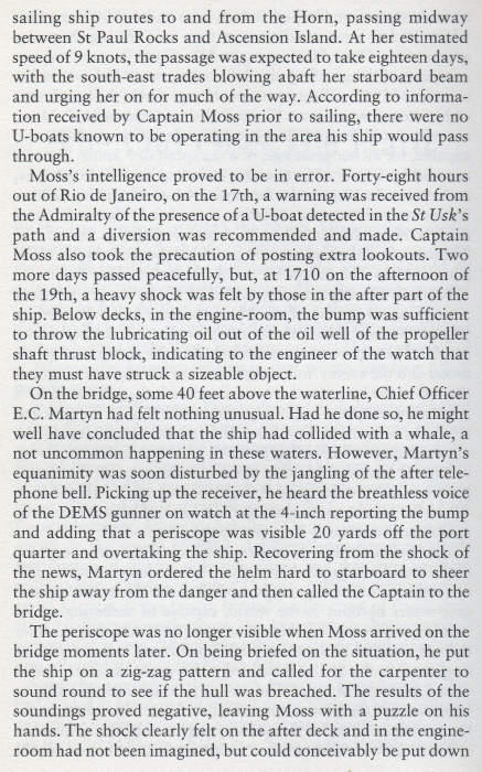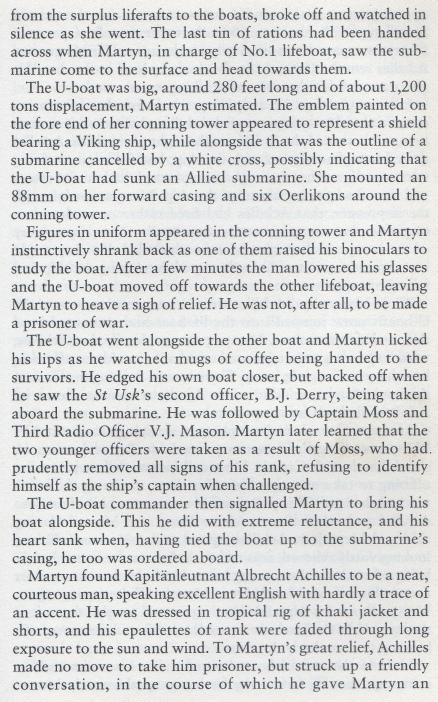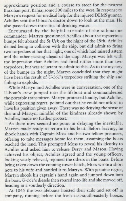 Shortly afterwards the U-boat surfaced and went to the boat in charge of the master, taking him, the second officer and the third radio officer aboard for questioning and handed hot coffee to the remaining survivors. The chief officer who was in charge of the second lifeboat was also taken aboard and Achilles apologized for sinking their ship before questioning them. The Germans drew their current position and the course to Salvador da Bahia on the maps carried by the survivors and when asked for extra water they filled two tins and placed them in the boats, but also removed the wireless set to prevent them to report the position of the U-boat. The chief officer asked the commander about some bumps and thuds felt aboard at 21.10 hours and 03.27 hours before being torpedoed and he confirmed that they had attacked their ship with one torpedo that missed astern and a spread of two that missed ahead due to the zigzag course steered by the ship that was discontinued during the night. The injured gunner was dressed by the German doctor who then took photos of the survivors in the boats together with several other crew members. The master who was not in his uniform had not disclosed his identity at this point, but when the U-boat commander told them he would keep the other two men taken from his boat as prisoners aboard he declared that he was the master in order to save the two young officers from captivity. He wrote a message to his wife and handed it to the chief officer before being taken down into the conning tower. The other three men were allowed to return to the boats and the U-boat then left the area, but the master was lost when U-161 was sunk one week later.
