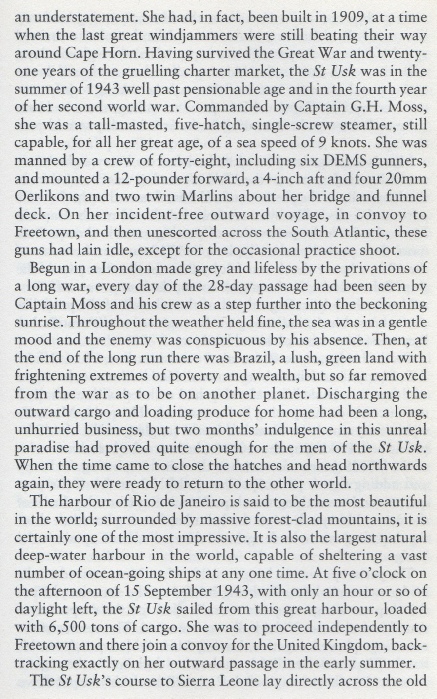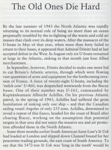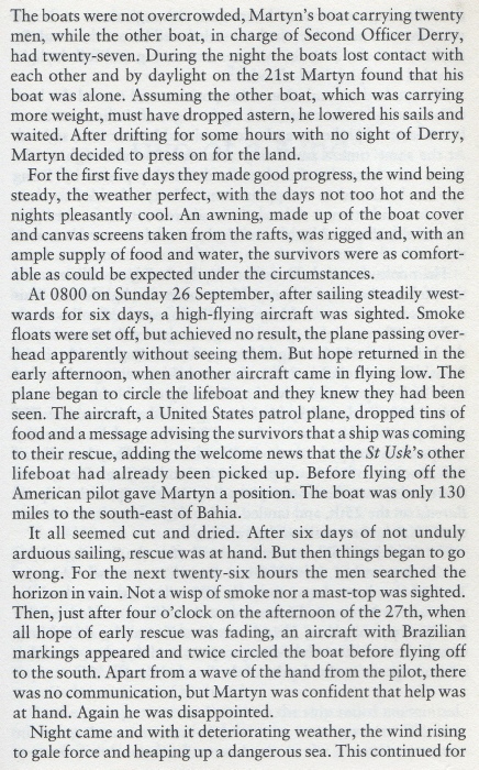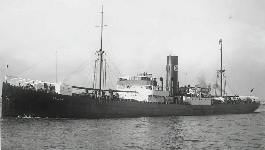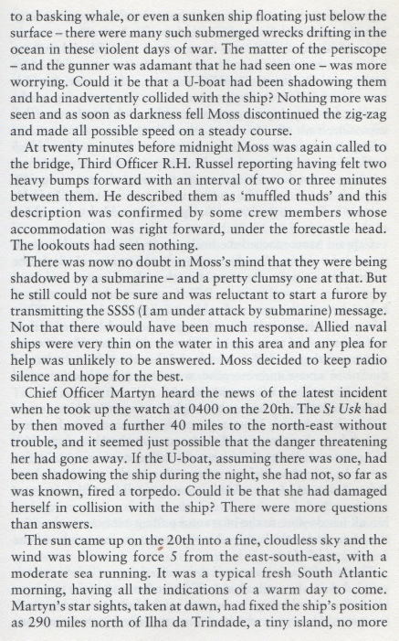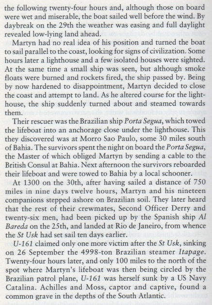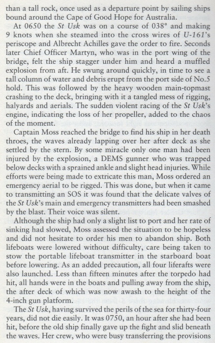 At 10.50 hours on 20 Sep 1943 the unescorted St. Usk (Master George Henry Moss) was hit on the port side aft in #5 hold by one torpedo from U-161 while steaming on a non-evasive course at 9 knots about 240 miles north of Martim Vaz Rocks. The explosion blew the hatches off the hold, smashed derricks and either broke the shaft or carried the propeller away as the engines raced violently until they were shut down. The after end flooded rapidly and settled to deck level in a few minutes. The crew of 42 men and six gunners (the ship was armed with one 4in, one 12pdr and four 20mm guns) abandoned ship within 15 minutes in the two large lifeboats carried aboard. No distress signals were sent because the main-topmast with the main aerial came down and fell over the emergency aerial, but a wireless set was placed into the starboard lifeboat. The boats could be lowered without difficulty in moderate sea and fine weather as the ship only had a slight list to port. The survivors had released four rafts before leaving in the boats and then collected their stores before the ship sank by the stern at 11.50 hours. The only casualty was one of the gunners who suffered a fractured skull.