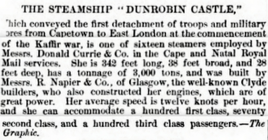 On 27th January 1879 she brought the first news to Britain about the Zulu victory at Isandhlwana, 110 miles northwest of Durban on the Buffalo River, when 18000 Zulus surprised four companies of the 24th Foot Regiment and virtually annihilated them when they killed some 800 men. Led by Cetawayo the Zulus lost 2000 warriors.