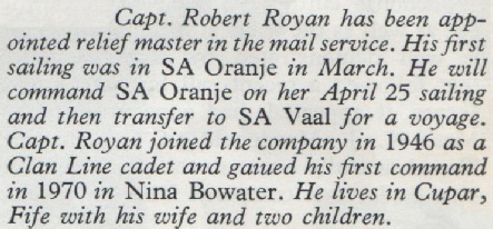 RIP. I had the privilege of sailing under Captain Royan on 5 trips on the SA Oranje from March 75 to her final run to Durban in October of the same year. A real gentleman. Happy memories. Rest in peace Sir |