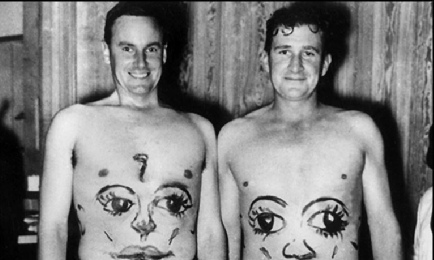 Peter May and Jim Laker as Tweedle Dum and Tweedle Dee in the ship’s fancy dress competition
