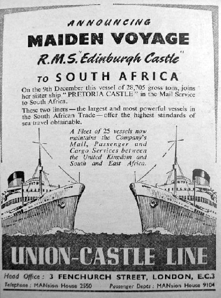 In 1956 the MCC cricket team sailed in Edinburgh Castle to tour South Africa.