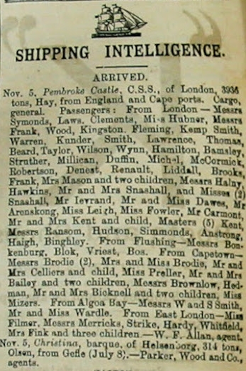 The Pembroke Castle seems to have arrived in Natal on 5 November 1889. I am assuming at this stage that the reported fire occurred in Cape Town when the vessel was on its way back to England but there is no certainty.