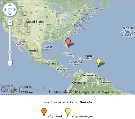 At 09.02 hours on 7 Jul, 1942, the Umtata (Master R. Owen Jones) was torpedoed and sunk by U-571 northeast of Key West in the Florida Strait, while under tow by the American tug Edmund J. Moran. The master and 91 crew members were picked up by the tug, transferred to USCGC Thetis (WPC 115) and landed at Miami.