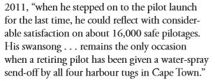 In 1974 we were both transferred to Cape Town, here John came to dominate the pilot’s wardroom, no mean feat when I say that the senior pilot Willy Rowe was himself a legend for reliability and ability. Of course came the day when John, reaching the age of sixty-three was obliged to retire. I put it this way because John wrote to the Administration offering his services free if they would allow him to continue piloting ships.